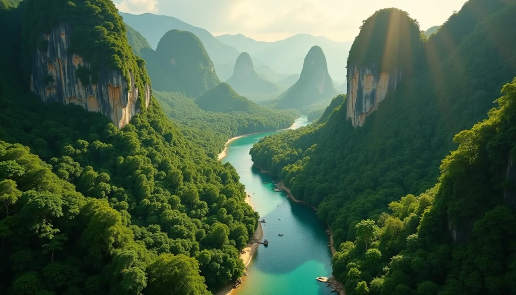 Considéré comme l’une des plus anciennes forêts tropicales du monde avec ses 160 millions d’années, le parc national de Khao Sok offre des paysages à couper le souffle. Son joyau est le lac Cheow Lan, un immense réservoir aux eaux émeraude ponctué de pics calcaires vertigineux rappelant la baie d’Halong au Vietnam. La jungle dense qui recouvre le parc abrite une biodiversité exceptionnelle, avec plus de 5% des espèces animales mondiales sur seulement 0,01% de la surface terrestre.